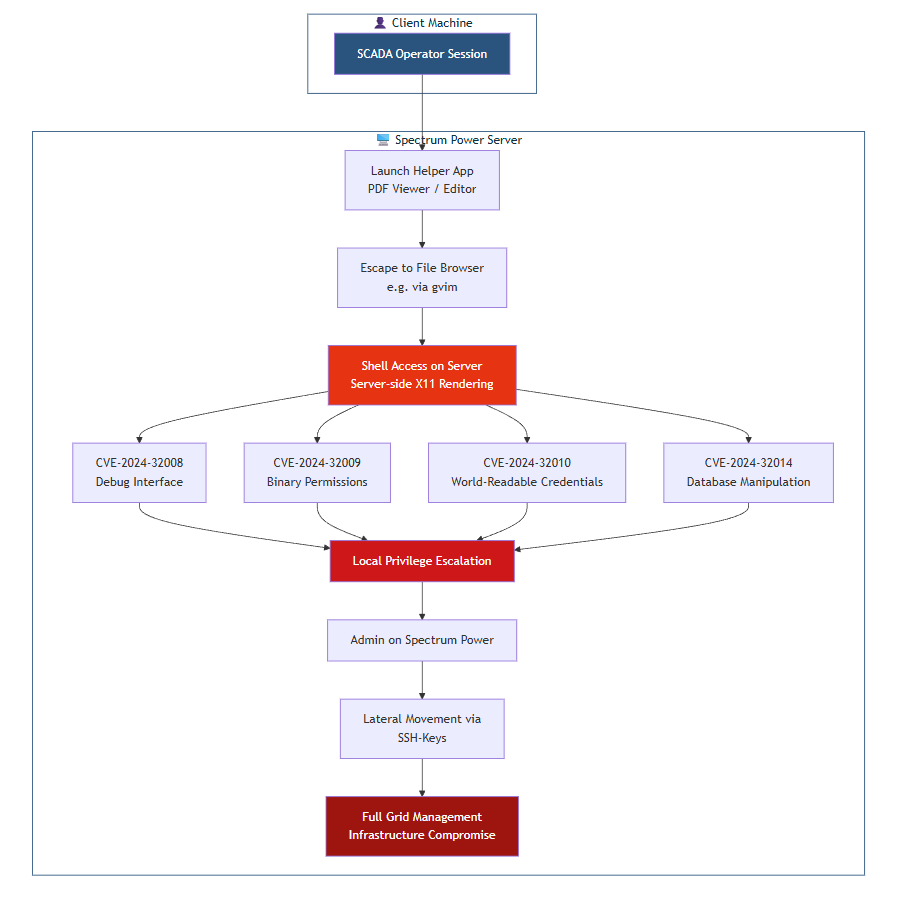 From this initial foothold, an attacker can chain the local privilege escalation vulnerabilities (CVE–2024–32008, CVE–2024–32009, or CVE–2024–32010) to achieve full administrative control of the server. Given the interconnected nature of Spectrum Power deployments, this can enable lateral movement across the entire grid management infrastructure.